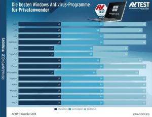 Das AV-TEST Institut hat im November und Dezember 2025 insgesamt 28 Sicherheitslösungen für Privatanwender und Unternehmen unter Windows 11 getestet. Im Anhang finden Sie die