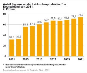 Nach Angaben des Bayerischen Landesamts für Statistik produzieren bayerische Betriebe von Unternehmen mit 20 oder mehr Beschäftigten im Jahr 2021 insgesamt 62 721 Tonnen Lebkuchen.