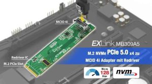 Die EXLink MB408A5 Adapterkarte wurde entwickelt, um Standard-PCIe (x4) Slots mit der MCIO 4i (SFF-TA-1016) Schnittstelle der nächsten Generation zu verbinden und eine Hochgeschwindigkeits PCIe
