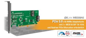 Der ICY DOCK EXLink MB308A5 ist eine PCIe 5.0 x16 NVMe Host Adapterkarte mit dualer MCIO 8i (SFF-TA-1016) Konnektivität, entwickelt für NVMe Hochgeschwindigkeitsverkabelung der nächsten