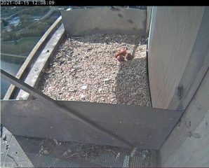 Die Wanderfalken am Schornstein des Heizkraftwerks Römerbrücke in Saarbrücken erwarten Nachwuchs. Heinz und Hilde2, wie die Falken von den Kunden der Energie SaarLorLux getauft wurden,