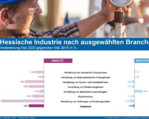 In Zeiten der Corona-Pandemie verzeichnet die hessische Industrie rückläufige Konjunkturindikatoren: Im Vergleich zu Mai 2019 fielen die Umsätze im Mai 2020 um 26,2 Prozent, die