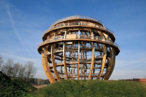 Eine begehbare Kugel aus Holz und feuerverzinktem Stahl ist das Kernstück des inMotion Parks im oberpfälzischen Steinberg am See. Mit einer Gesamthöhe von 40 Metern