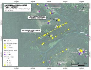 Quarterback Resources Inc. (CSE: QB; Frankfurt: H89) („Quarterback“ oder das „Unternehmen“) freut sich, ein Update zu den Ergebnissen seines Phase-I-Explorationsprogramms auf dem Goldprojekt Twin bekannt