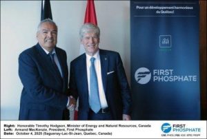 First Phosphate Corp. („FirstPhosphate“ oder das „Unternehmen“) (CSE: PHOS) (OTCQX: FRSPF) (FWB: KD0) war erfreut, den kanadischen Minister für Energie und natürliche Ressourcen, Timothy Hodgson, den