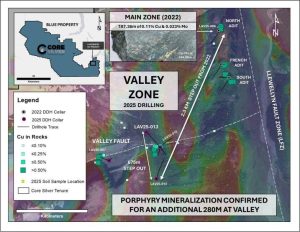 Core Silver Corp. („Core Silver“ oder das „Unternehmen“) (CSE: CC) (FWB: 8ZR) (OTCQB: CCOOF) freut sich, die Analyseergebnisse der Bohrkampagne 2025 im Konzessionsgebiet Blue (das