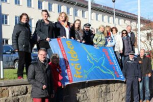 Sie flattert wieder vor dem alten Haupteingang des Lauterbacher Landratsamtes, die blaue Fahne der Menschenrechtsorganisation „terre des femmes“. „Nein zu Gewalt an Frauen“ und „Frei