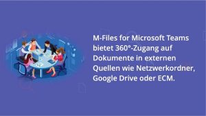 Die KI-gestützte Lösung von M-Files verbindet Business-Systeme, optimiert Arbeitsabläufe und unterstützt Compliance. Das Dokumentenmanagement und die Zusammenarbeit in Microsoft Teams werden so deutlich verbessert. M-Files,