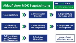 Durch den Medizinischen Dienst (MD) oder andere Gutachterstellen wird festgestellt, wie stark eine Person in ihrem Alltag auf Pflege und Unterstützung angewiesen ist. Der Prozess
