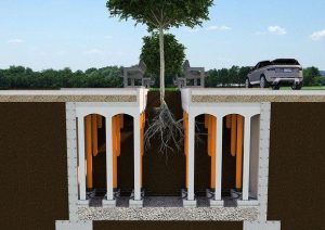 Neu Elevator Wurzelschutz erlaubt Bäumen und Sträuchern unter der Straße freies Wachstum ohne gefährliche Verformungen oder Asphalt Heben. Mit Neu Elevator Wurzelschutz werden Schutz-Zellen unter