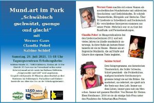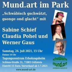 Samstag, 24. Juli: Mund.art im Park. „Schwäbisch gschwätzt, gsonge ond glacht" mit Werner Gaus, Claudia Pohel und Sabine Schief, Tagungsstätte, 71083 Herrenberg-Gültstein, Erholungsheimstr., 15 Uhr.
