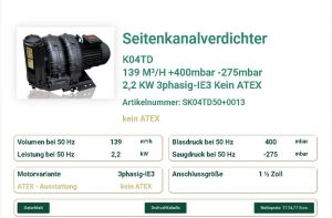 Heute beschreiben wir den Seitenkanalverdichter K10TS von FPZ S.p.A. mit folgenden Spezifikationen: Typ: FPZ K10TS Luftvolumen: 1.539 m³/h Druckbereich: +250 mbar / -250 mbar Motorleistung: