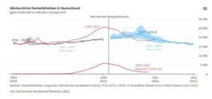 Nach einer Hochrechnung des Statistischen Bundesamtes (Destatis) sind in der 14. Kalenderwoche (5. bis 11. April 2021) in Deutschland 19 018 Menschen gestorben. Diese Zahl liegt