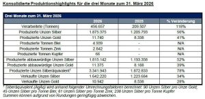 Endeavour Silver Corp. („Endeavour“ oder das „Unternehmen“ – https://www.commodity-tv.com/ondemand/companies/profil/endeavour-silver-corp/) (NYSE: EXK; TSX: EDR) meldet für das erste Quartal 2026 eine Produktion von 1.875.375 Unzen Silber