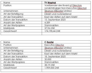 Sibanye-Stillwater, (https://www.commodity-tv. com/ondemand/companies/profil/sibanye-stillwater-ltd/) (Tickers JSE: SSW and NYSE: SBSW), veröffentlicht gemäß den Paragrafen 3.63 bis 3.74 der JSE Limited Listings Requirement (Kotierungsvoraussetzungen) das Folgende. In