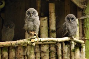 Noch etwas wacklig turnen die Mitte Juni geschlüpften kleinen Bartkäuze durch das Geäst ihrer Voliere oder sitzen aneinandergeschmiegt fast regungslos am Boden oder auf einem