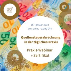 Grenzüberschreitende ErwerbstätigkeitPraxis-Webinar + Zertifikat Thema: Quellensteuerabrechnung in der täglichen Praxis am26. Januar 2022 von 10:00 – 11:00 Uhr Die richtige Abwicklung der Quellensteuer für ausländische