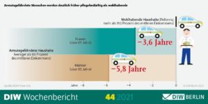 Ärmere Personen haben ein höheres Risiko, pflegebedürftig zu werden und sind früher auf Pflege angewiesen als Menschen mit hohen Einkommen. Gleiches gilt für Arbeiter und