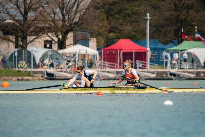 Lene Mührs und Hannah Reif (Kettwiger RG/Frankfurter RG Germania) haben bei der Deutschen Kleinbootmeisterschaft 2026 (DKM) auf der Regattabahn Oberschleißheim