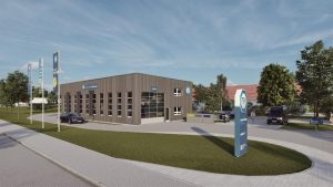 Moderne Architektur, Holzbauweise, innovatives Energiekonzept, PV-Anlage, E-Tankstelle, neueste Prüftechnik – TÜV SÜD baut den Prototypen für die Prüfstelle der Zukunft in Münsingen bei Reutlingen. Spatenstich