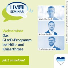 GLA:D® ist ein evidenzbasiertes, physiotherapeutisches Versorgungskonzept für Hüft-, und Kniearthrosepatient*innen. Durch Edukation, Lebensstiländerung und Aktivität soll das Fortschreiten der Arthrose in der Entstehung verhindert werden.